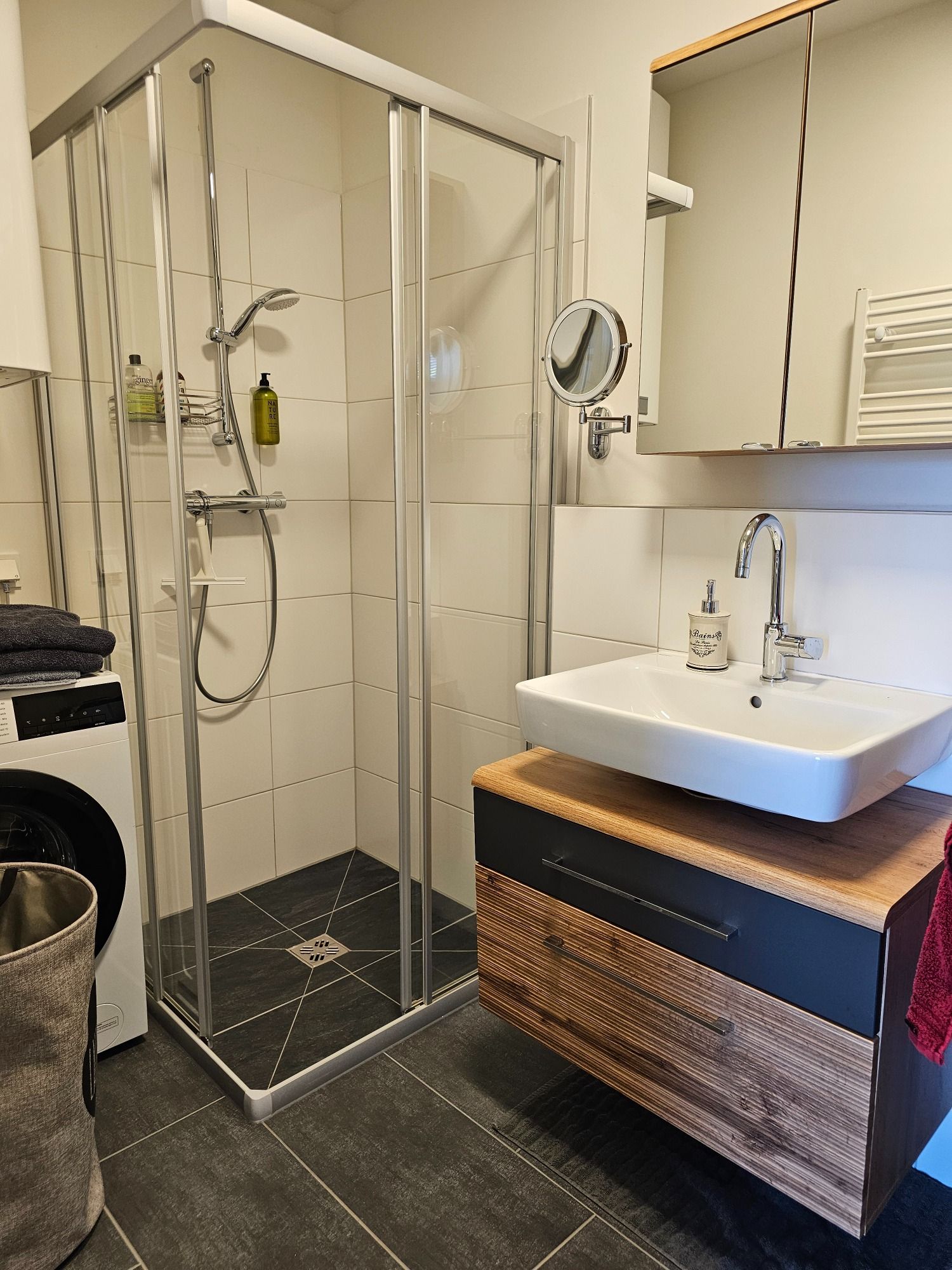 - Eine Waschmaschine im Bad steht notfalls bereit.