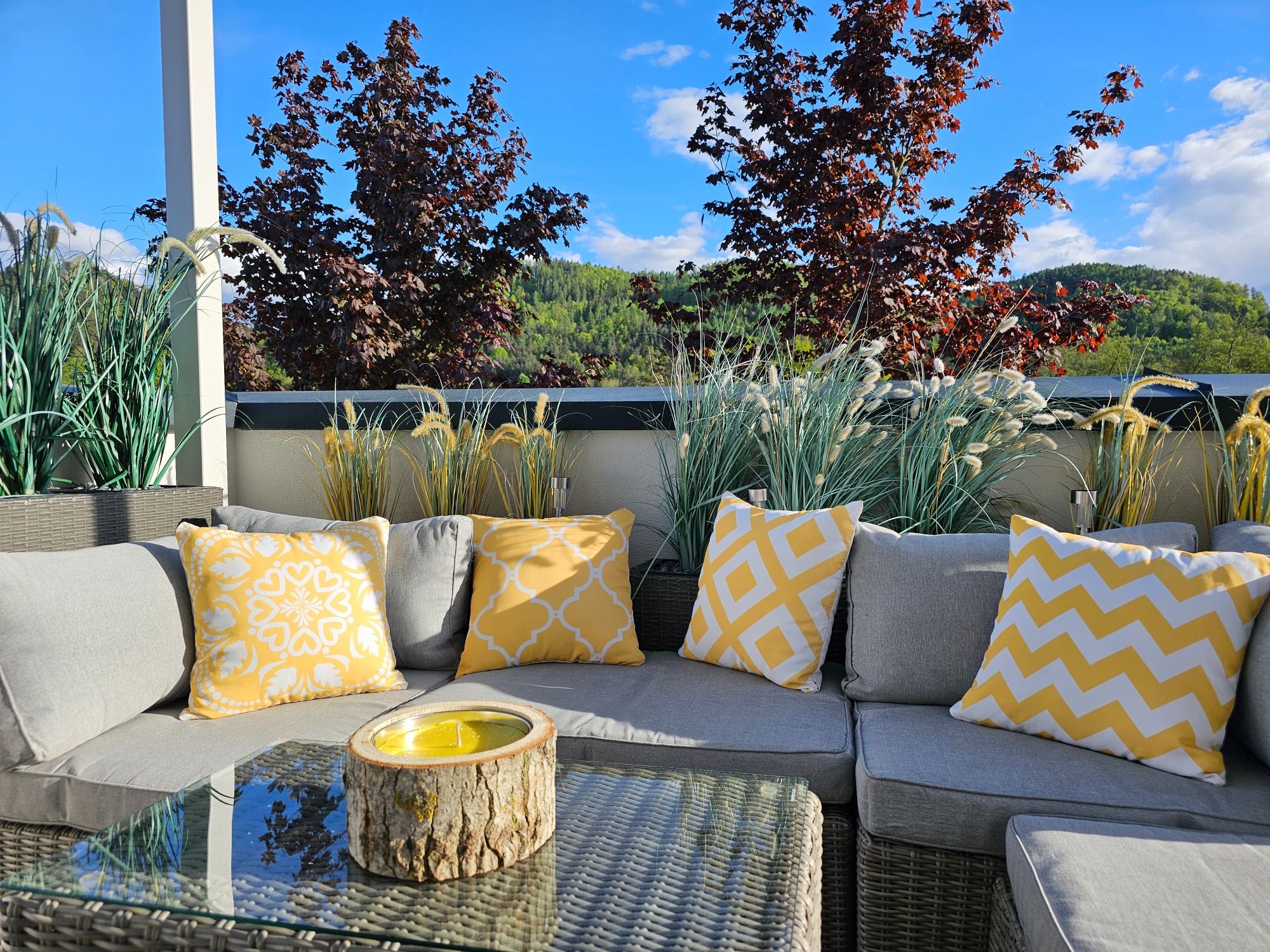 Die private Südterrasse mit 22m² und Rundumblick ladet zum Relaxen ein.